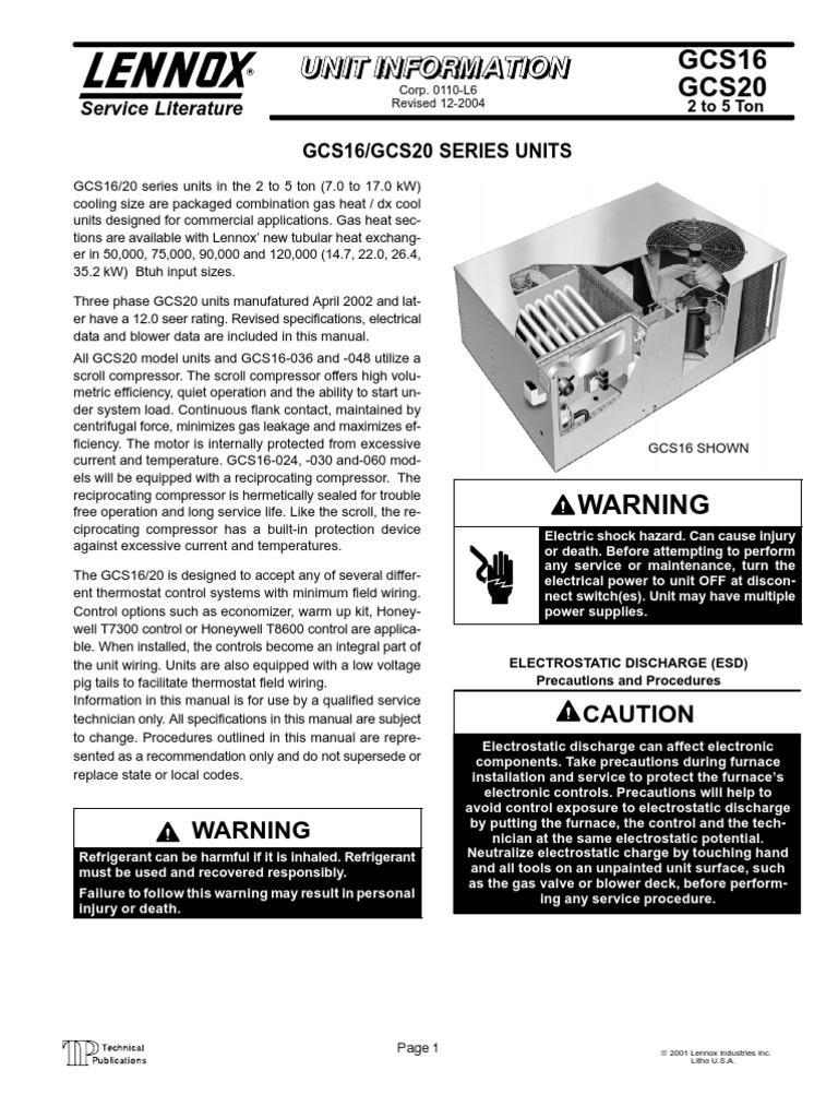 Ari standard 210 240 ratings gcs 16 basic unit application lennox gcs 16 dx cooled and gas fired all season units are designed for outdoor rooftop or ground level installations in resi dential or light commercial applications.